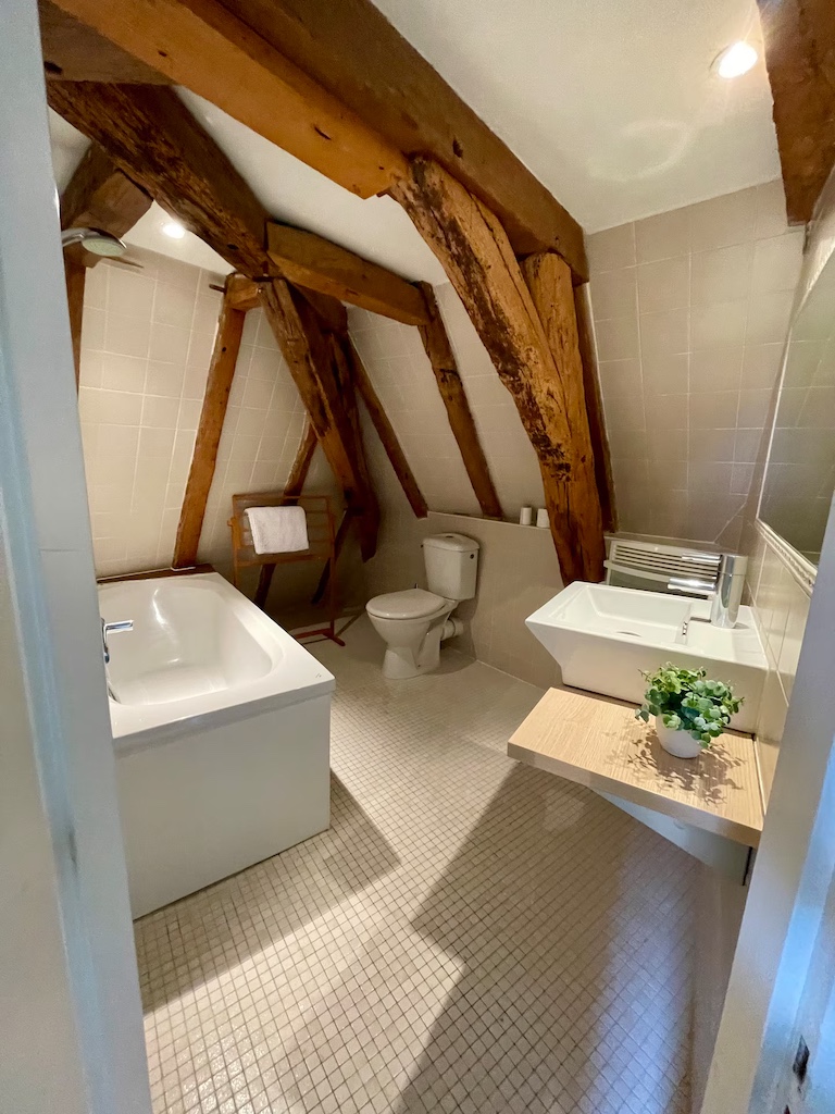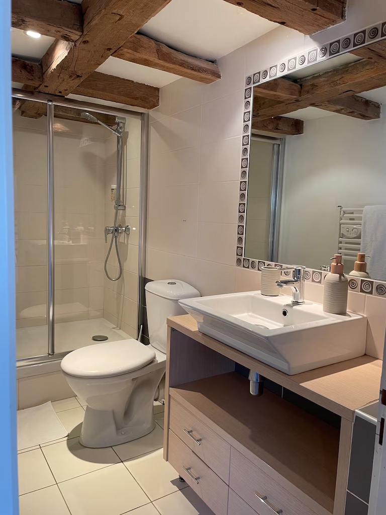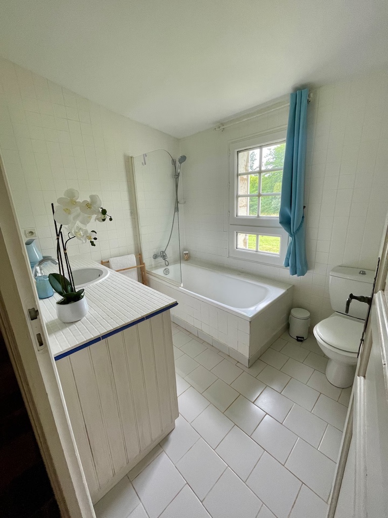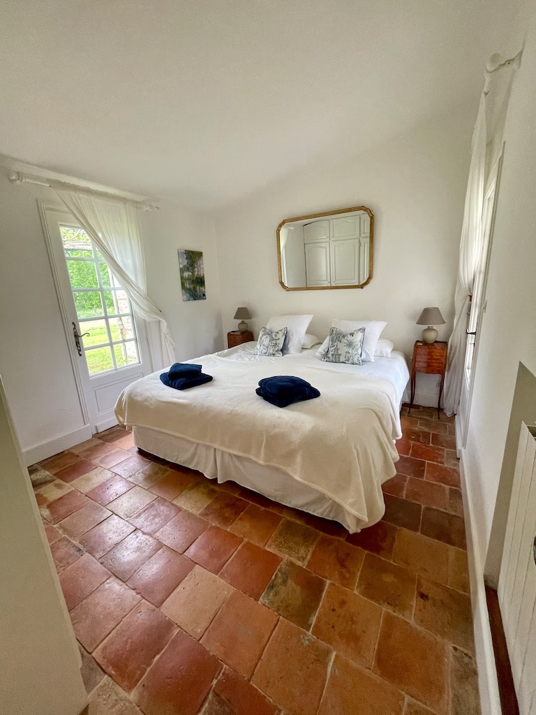 There are 2 double bedrooms (one with a double bed 140 , the other with two single beds 90 x 2 which can be placed together as a double bed 180) and a bathroom with wc, bath and basin and a private walled garden.There is a another washing machine and dryer available in an outbuilding
