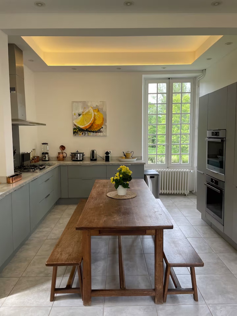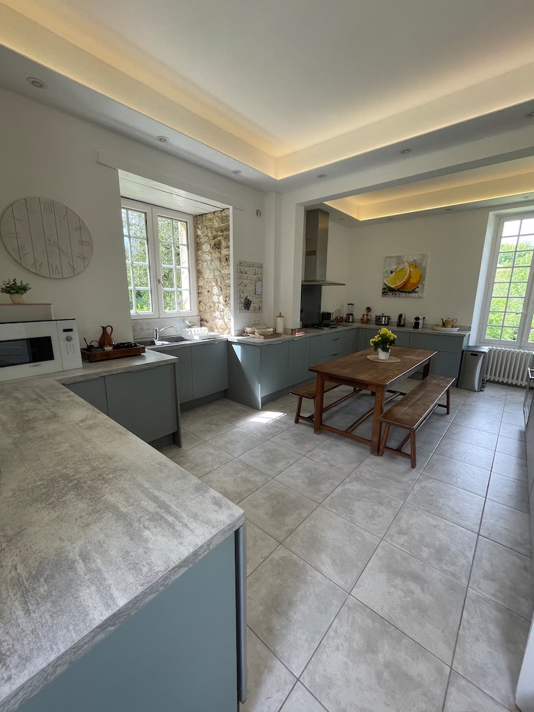 Pigeonnier kitchen: gas and electric hob, electric oven, fridge freezer and another small fridge, microwave,dishwasher, washing machine and dryer