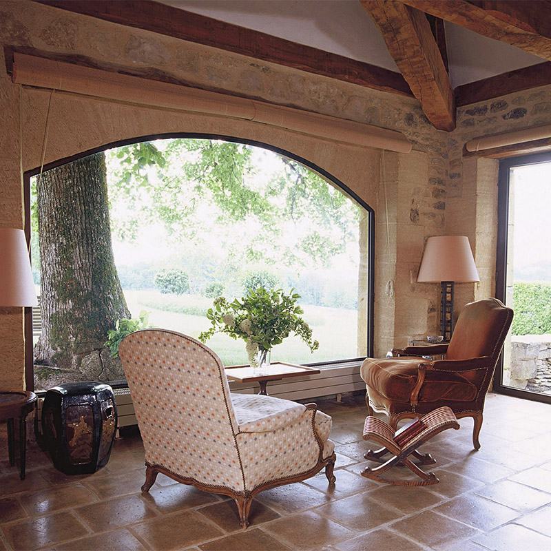 Main living Room – through the kitchen/dining/living area, this large-high ceiling room features a picture window at its far end and glass doors opening onto the terraces on either side. The sitting room also comprises comfortable sofas and armchairs, a wood-burning fireplace, satellite flat-screen TV (with international channels, Apple TV+, Disney+, Netflix, Amazon Prime, Canal+/CanalSat, CD and Blue Ray DVD players), a radio and a Sonos bluetooth music speaker.