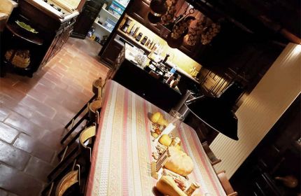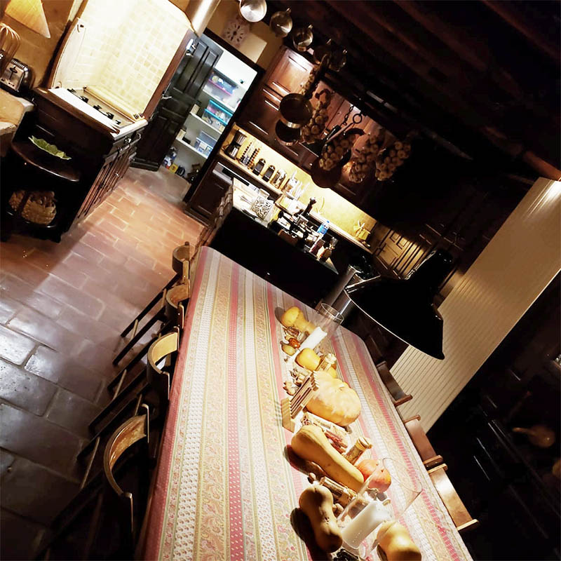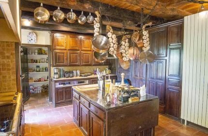 Kitchen/Dining/Living area – opening to the right of the hall is an extensive open plan living area comprising a ‘no-expense-spared’ kitchen and dining table seating 14. The kitchen includes 2 ovens, 4 electric hobs and 2 gas rings, a grill and deep-fryer, a microwave, 3 fridges and 3 freezers, 2 dishwashers, a blender, 2 toasters, 3 coffee makers and a double sink with a waste disposal unit, 3 bins for recycling, etc. Next to the dining table, the sitting area has a massive wood-burning fireplace and 2 very comfortable armchairs and 2 sitting chairs.