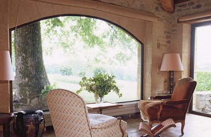 The dining area seats 16 The sitting area has a large woodburning fireplace and 2 comfortable armchairs. Off the kitchen / dining area / living area is the large high ceilinged living room (10 x 7m) with a picture window at its widest Armchairs has a massive wood burning fireplace and a TV with CNN, BBC and French satellite, a CD tape radio , DVD player and video player