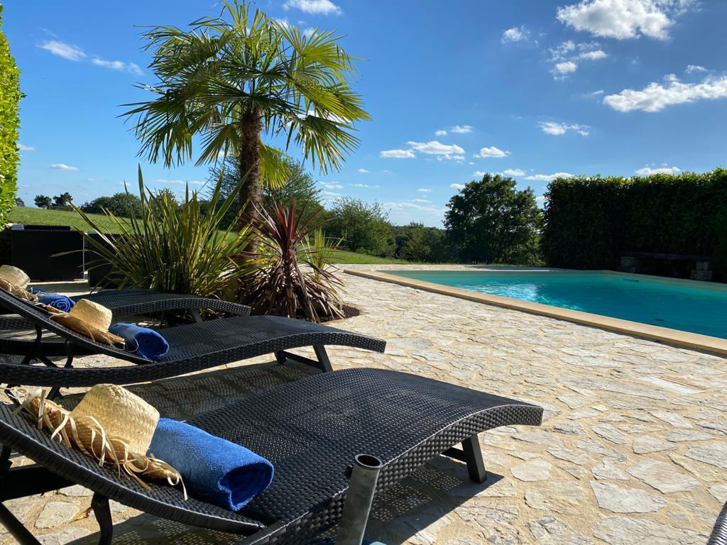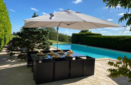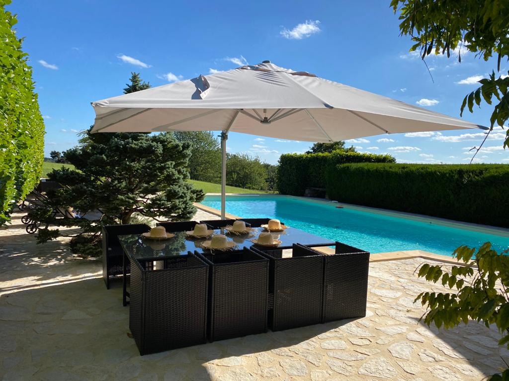 The filtered, alarmed (2) and heated swimming pool with underwater lights measures 13.5 x 6 metres, with a maximum depth of 2.5 metres, and Roman steps at its shallow end. There’s an extensive range of pool furniture, including a table seating 8 with its large umbrella, 3 other umbrellas to protect the long chairs and the outside living room.