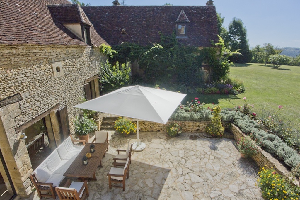 In the centre of the “U” is a south-facing courtyard with a dining table seating 10, shaded by a large sun umbrella.