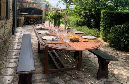 Accessed from the kitchen/dining/living Area is the west-facing terrace, with a table seating 12, shaded by trees and a large sun umbrella. Nearby is the real wood barbecue.